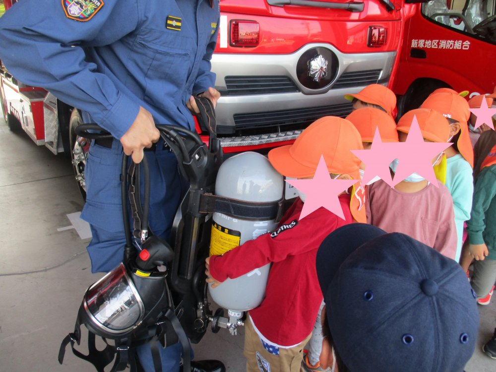 署員の方から消防署の仕事や設備について説明をいただいた後、消防服を着させていただいたり、ボンベなどの装備を体験させていただきました。