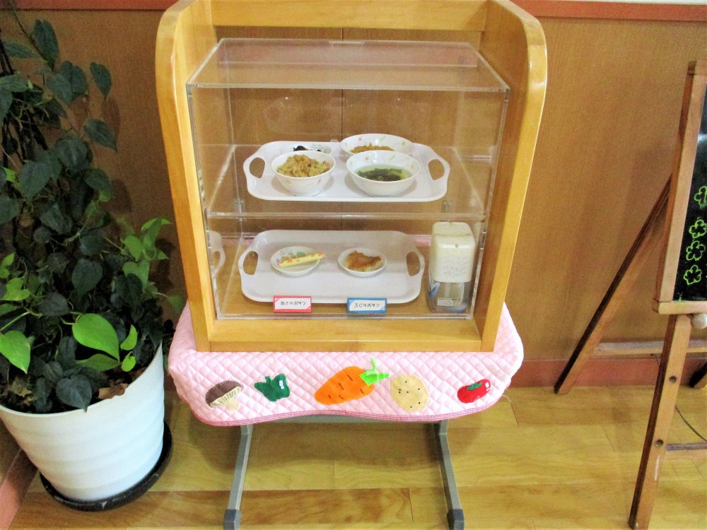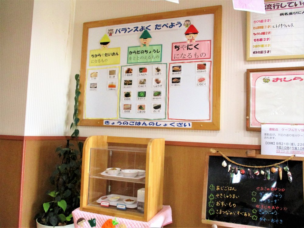 当園では「食育」を大きな柱としており、エントランスには「給食・おやつ展示ケース」と「メニューボード」と「三大栄養素のボード」を設置しています。