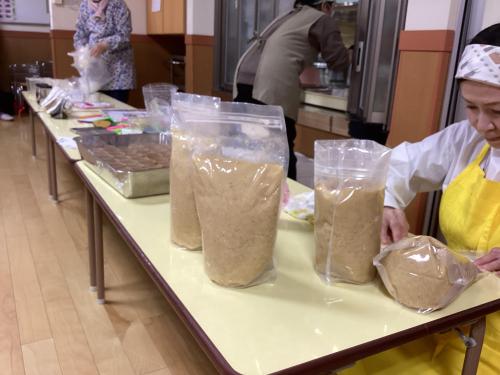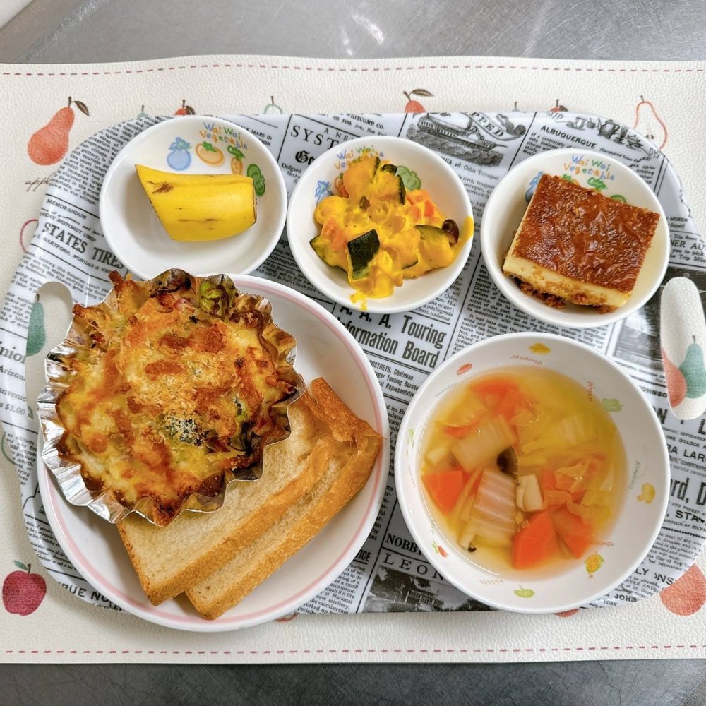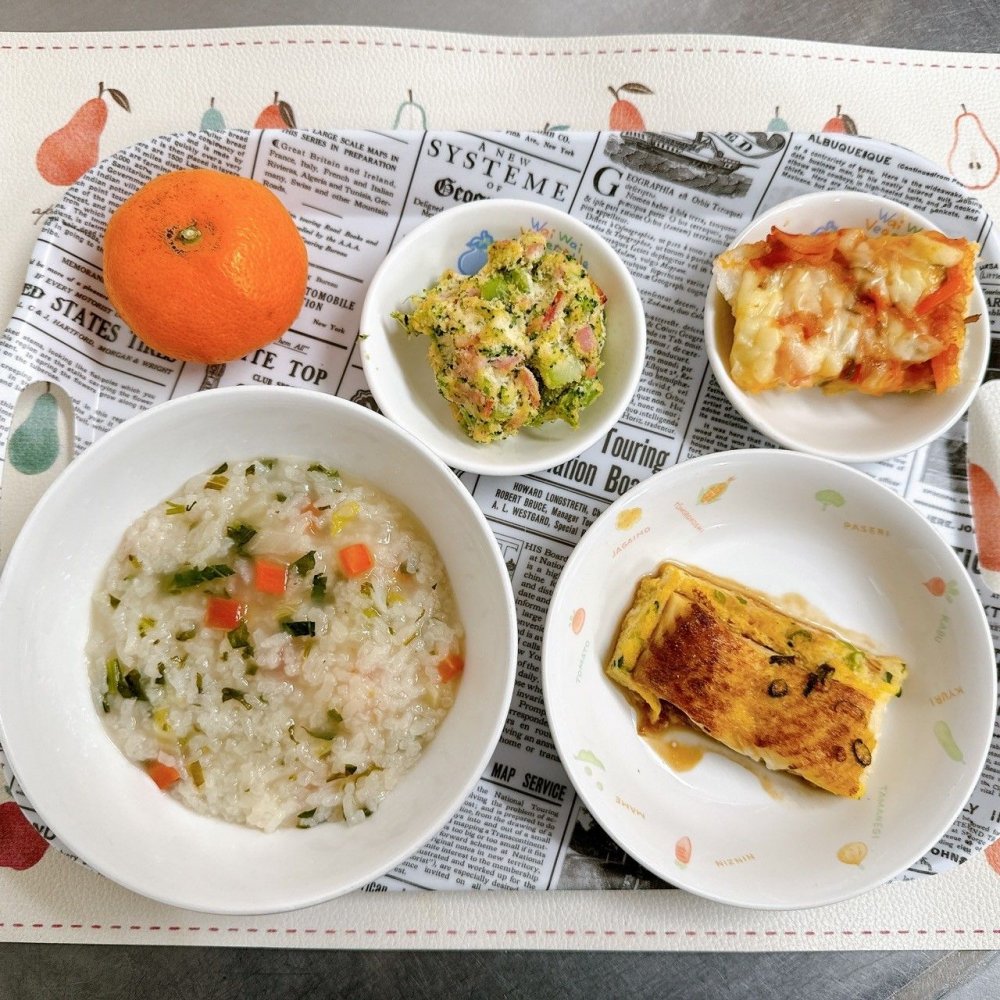 《お昼ごはん》・チキンライス・魚のフライ・コンソメスープ・ポテトサラダ・オレンジ《3時の手作りおやつ》・きな粉揚げパン (画像右上)