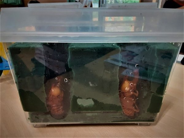 幼虫から蛹になったのですが、腐葉土の中だと観察できないので、オアシスで人口蛹室を作って観察できるようにしました。