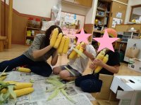 年長のスミレ組さんが、21日の給食食材のトウモロコシの皮むきを手伝ってくれました。