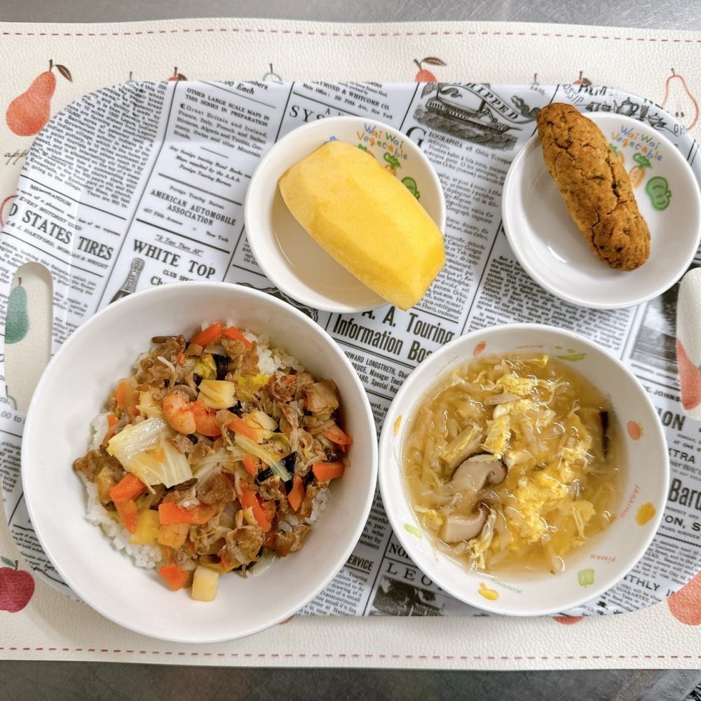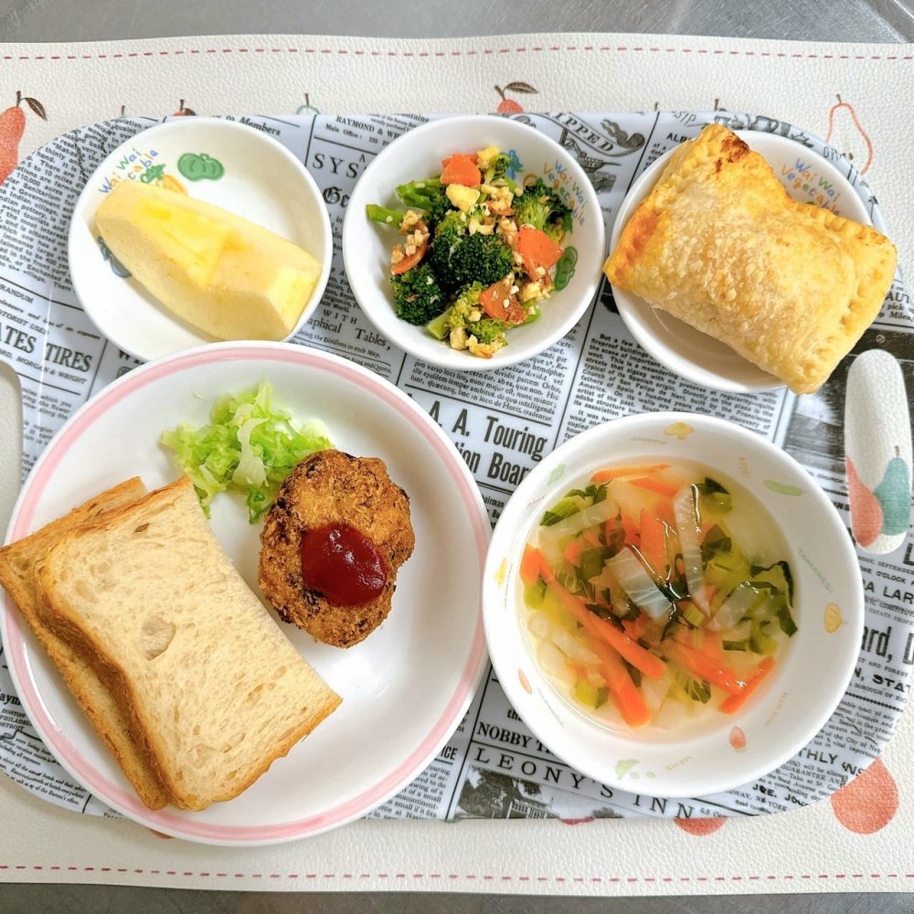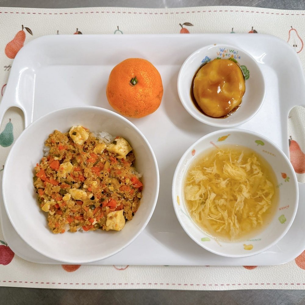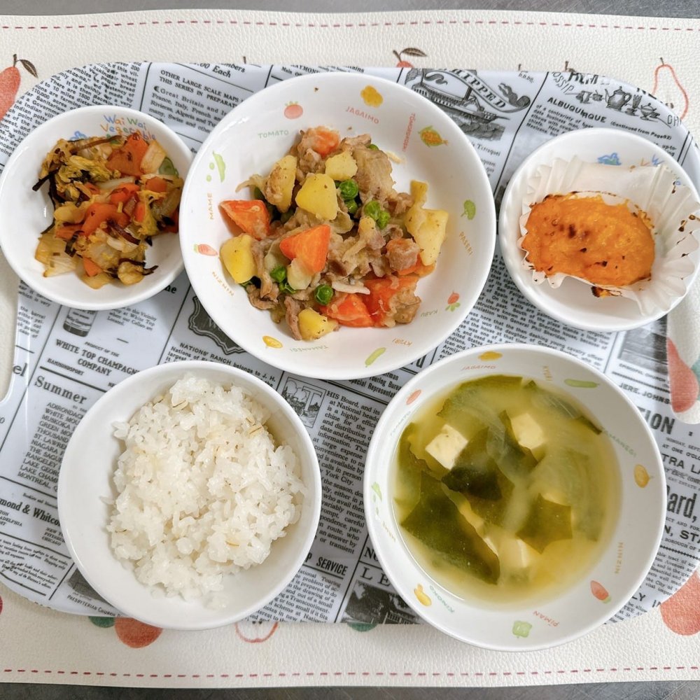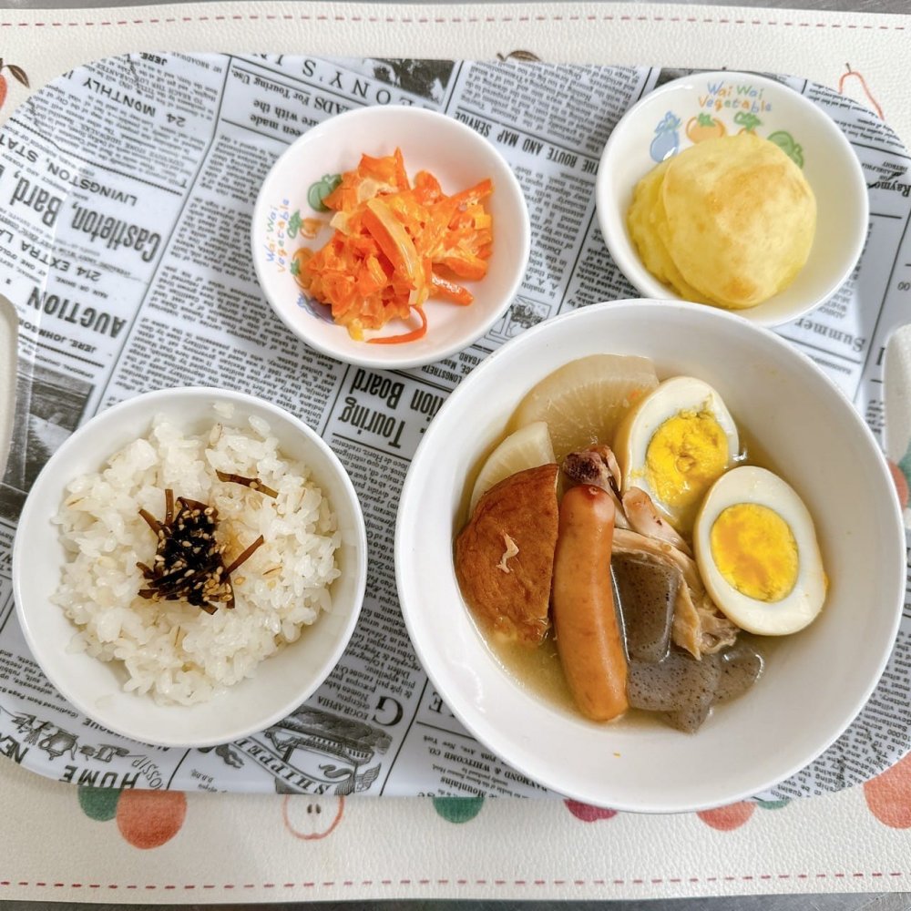 《お昼ごはん》・ご飯・昆布の佃煮・おでん・にんじんサラダ《3時のおやつ》・じゃが芋ボール〔手作りおやつ・画像右上〕