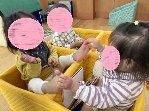 最初の画像は、わらべうた遊び「うしぬぱん」を、友達同士で楽しんでいる様子です