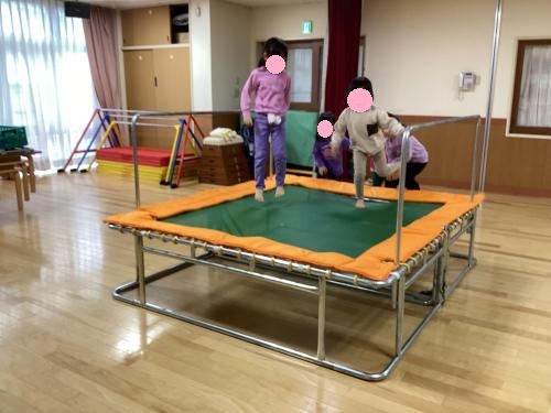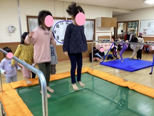 5才スミレ組は、トランポリンなどで楽しく体を動かしました!!