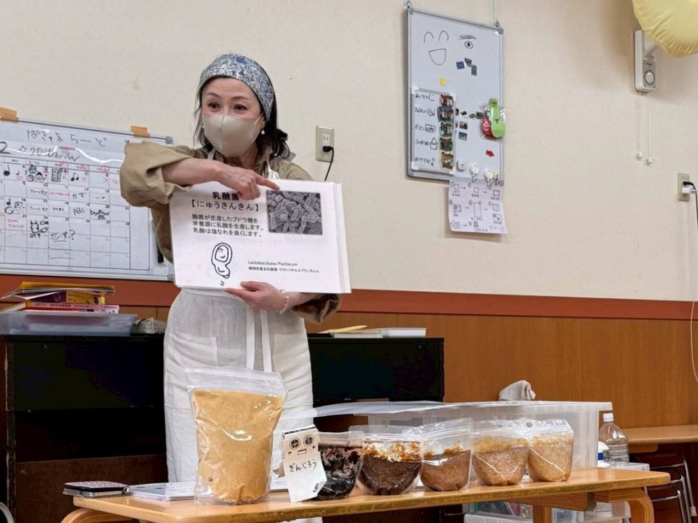 今回も飯塚市「MISO LABO」の安藤久代さんを講師としてお迎えし、みその原材料や発酵のしくみ、出来上がるまでの過程、そして食の大切さについて、とてもわかりやすく教えていただきました。